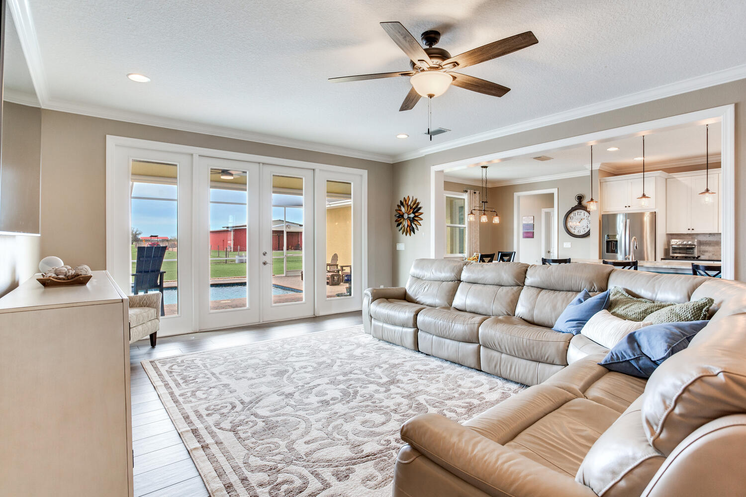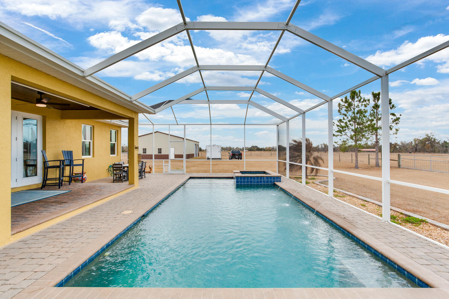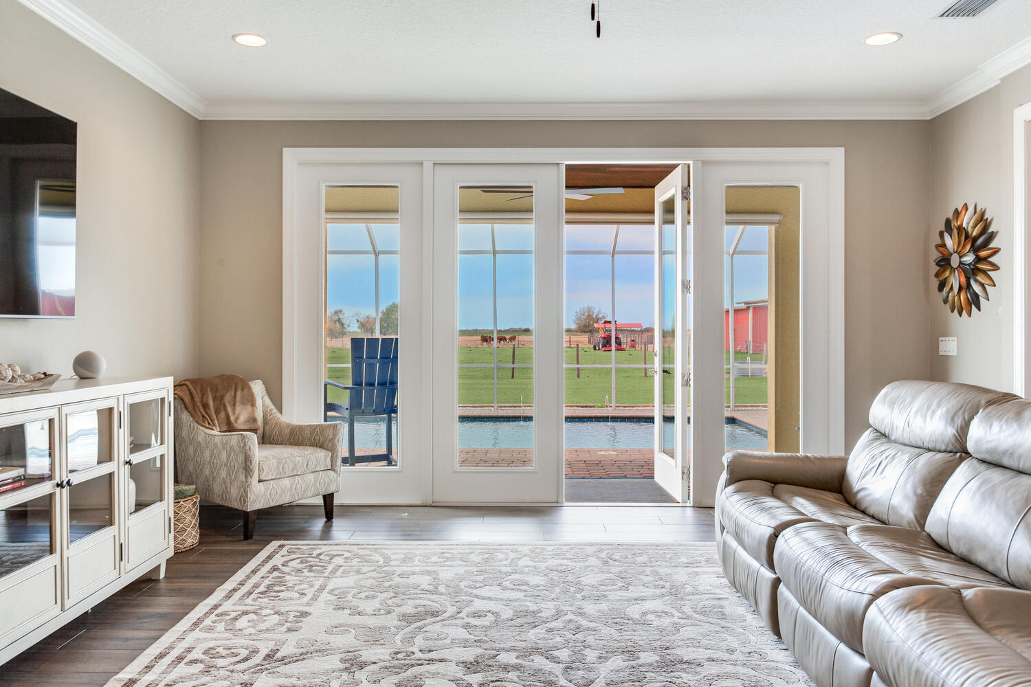 Outdoors, enjoy the custom built in-ground pool and spa, relax by the spring-fed pond stocked with largemouth bass, or host gatherings in the 48×48 livestock barn or fully insulated 65×28 auto collectors shop. These spaces offer endless possibilities for entertaining, hobbies, farming, or simply embracing country life.